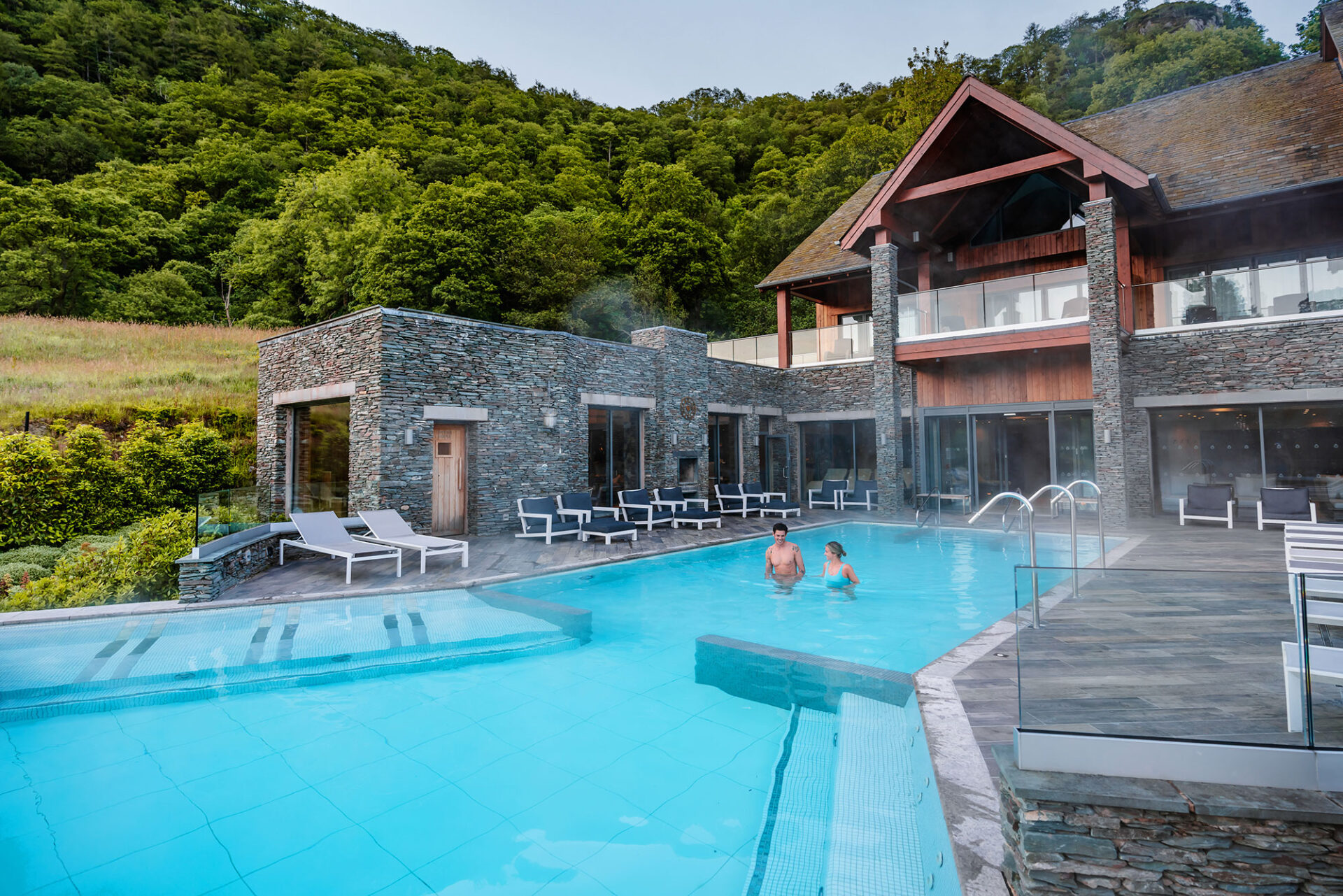 Outdoor hydrotherapy pool with views of Derwentwater.